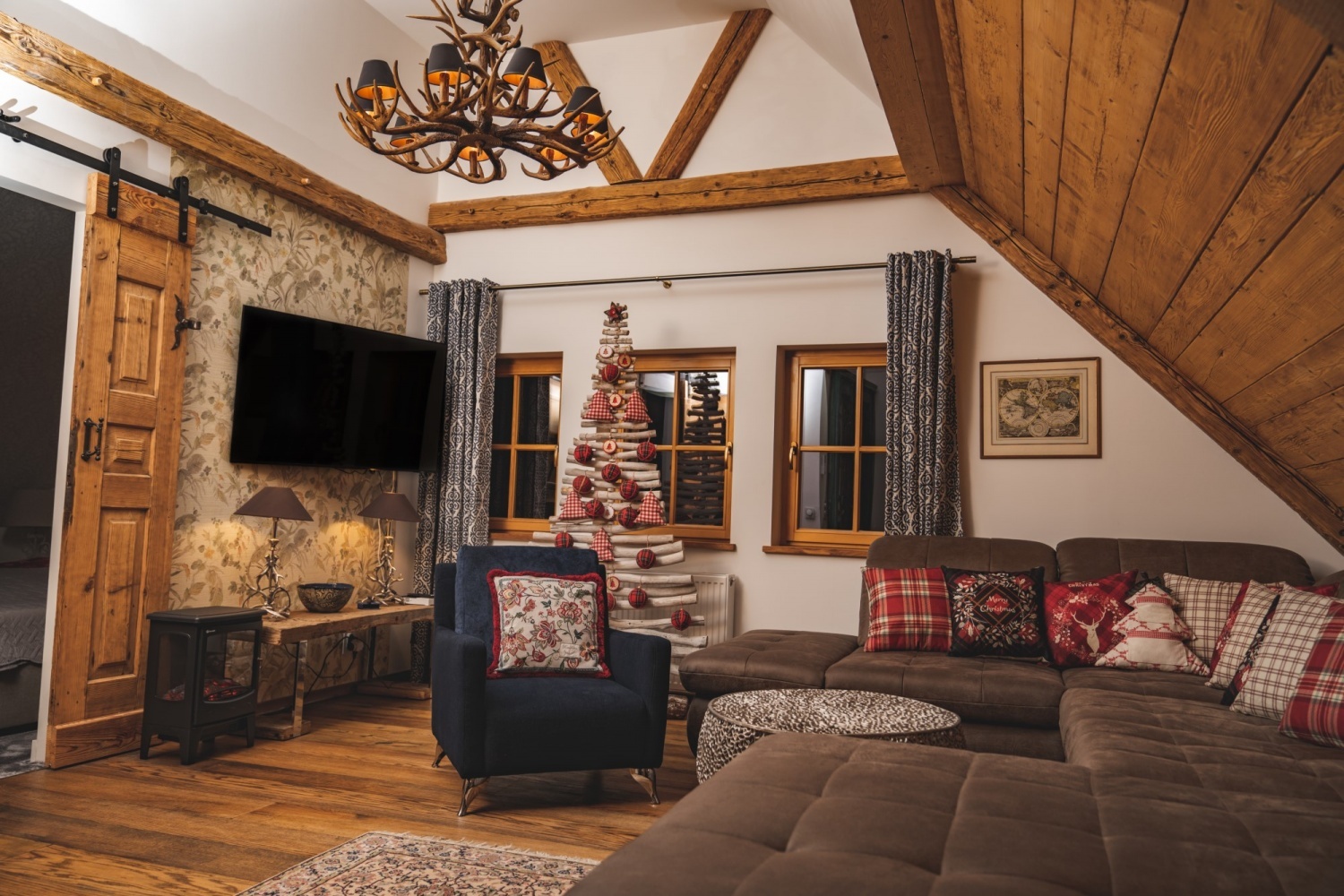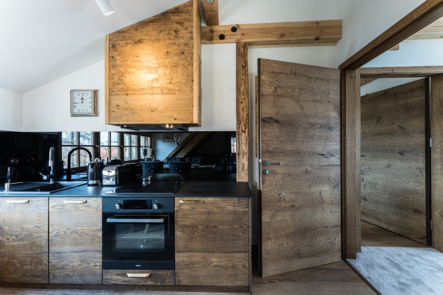 Architektura przypomina domy znajdujące się w Szwajcarii. Nieruchomość mieści się na 2 hektarowej działce graniczącą z lasem i rzeką.