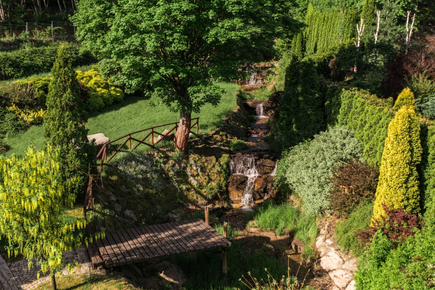 Wśród wspaniałego ogrodu przez teren przepływa naturalny górski potok tworzący kaskady i wodospady.