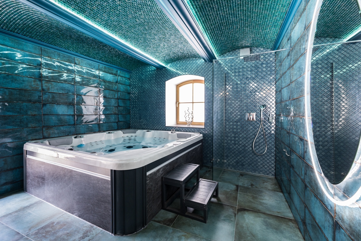 W obrębie budynku mieści się otwarty basen z miejscem do relaksu. W górnej części działki goście mogą odpoczywać na leżakach i w koszach podziwiając wodospad oraz wsłuchując się się w szum potoku i śpiew ptaków. Pod koniec lata powstanie tam luksusowa sucha sauna czyli tak zwana beczka z miejscem dla 8 osób, do schłodzenia się, będzie kąpiel pod wodospadem.